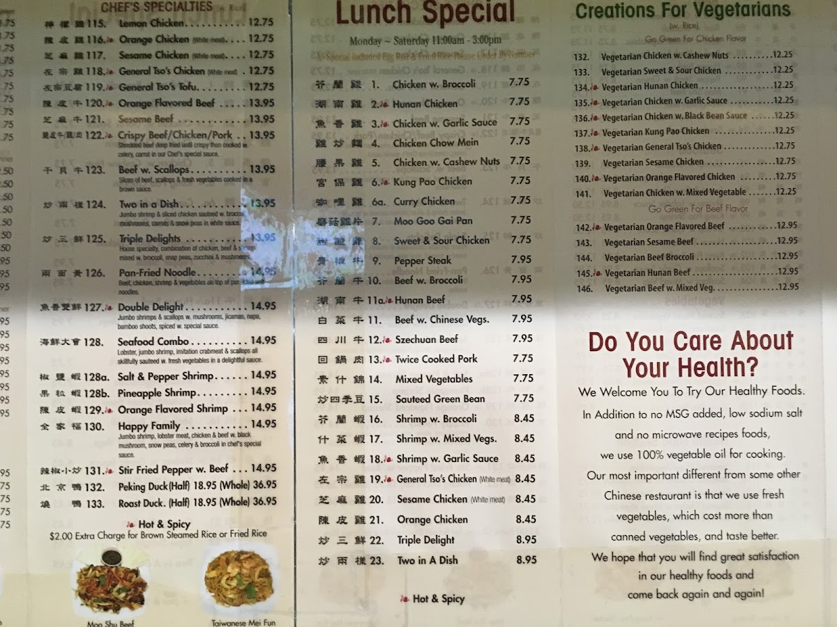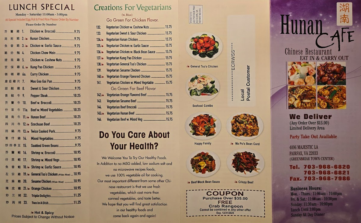 Hunan Cafe at 4096 Majestic Ln in Fairfax offers a menu that caters to a wide range of tastes, from classic appetizers to chef’s specialties and health-conscious choices. Starters like Egg Roll, Vegetable Roll, Fried Wonton, Fried Shrimp, and Crab Rangoon set a flavorful tone, while soups such as Wonton Soup, Egg Drop Soup, and Hot And Sour Soup provide comforting options. Noodle lovers can enjoy selections including Noodle Soup, House Special Noodle Soup, Seafood Noodle Soup, and the rich Braised Beef Noodle Soup. Vegetarians are well-served with dishes like Vegetarian Chicken With Cashew Nuts, Vegetarian Sweet And Sour Chicken, and Vegetarian Hunan Chicken, alongside health-conscious steamed offerings such as Steamed Mixed Vegetables and Steamed Chicken With Broccoli. Chef’s specialties including Lemon Chicken, Orange Chicken, Sesame Chicken, and General Tso's Chicken highlight the restaurant’s bold flavors. The dinner menu spans fried rice, flat noodles, Egg Foo Young, and a range of proteins, including Beef With Broccoli Dinner, Shrimp With Lobster Sauce Dinner, Chicken With Garlic Sauce Dinner, Twice Cooked Pork Dinner, and Ma Po's Bean Curd Dinner, ensuring every preference is covered. Lunch options mirror the dinner selections in smaller portions, such as Lunch Beef With Mixed Vegetables, Lunch Kung Pao Shrimp, and Lunch Chicken In Black Bean Sauce, offering value without compromising variety. Complementary sides like White Rice, Brown Rice, Pancakes 4 Pieces, and sauces including Plum Sauce and Dumpling Sauce, along with beverages like Coke 20oz, Sprite 20oz, Fanta Orange 20oz, and Ice Tea 20oz, round out the dining experience. Overall, the menu balances traditional Hunan flavors with diverse options for meat lovers, vegetarians, and health-conscious diners alike, making it a versatile destination for any meal.